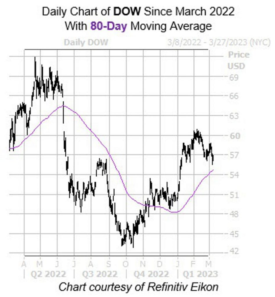 The shares of Dow (DOW) are up 11% so far in 2023, with a floor at the $55.50 level containing several pullbacks since January. While the $61 region stifled the equity’s February rally attempt, it looks as though it might break out again soon, as it nears a historically bullish trendline.