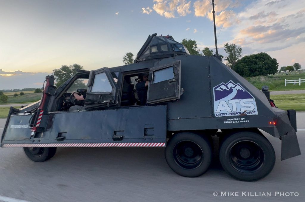 The TIV-2 is street legal, weighs 14,000 pounds and, with a turbocharged engine of some 600 hp, can reach speeds approaching 90 mph, necessary sometimes to stay ahead of a storm. Basically, the vehicle is a beast on wheels, and, as you can imagine, its unusual appearance garners attention everywhere it goes.