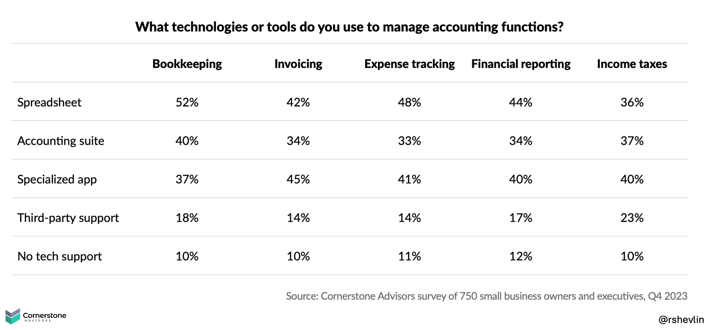 - Use of accounting technology is disjointed. Between a third and 40% of small businesses use an accounting suite (e.g., QuickBooks, Xero) for each of the accounting functions, but many also use a specialized app as well as a spreadsheet (see table below). The disjointed use of accounting technologies, coupled with the mix of internal and third-party resources, add up to one thing: Accounting is a hassle for many small businesses.