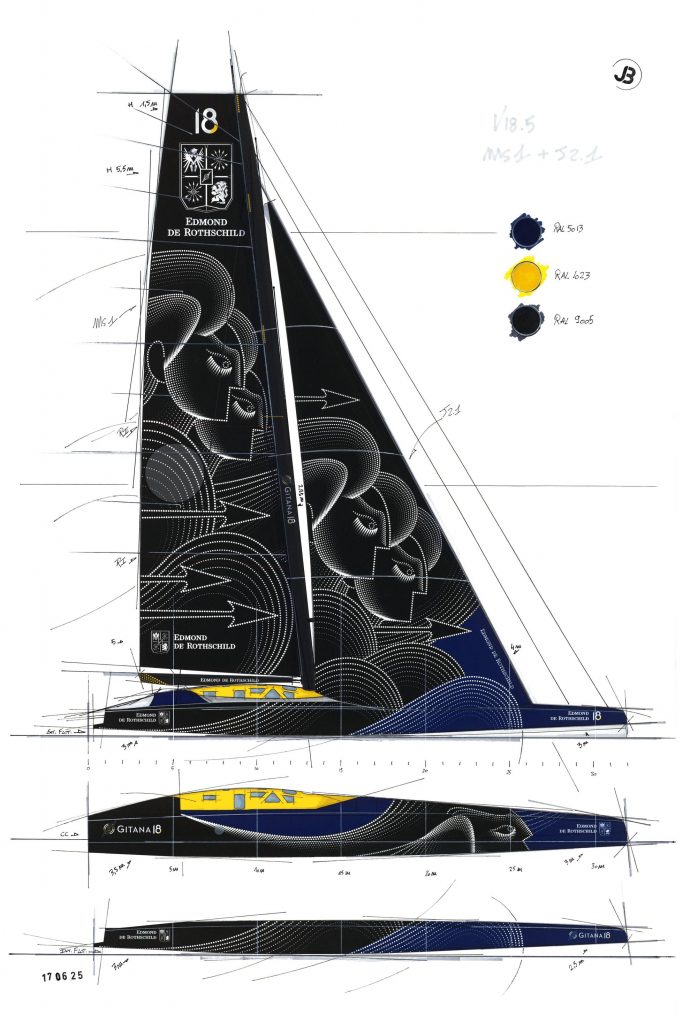 The 105 feet (32 meter) long and over 75 feet (23 meter) wide trimaran includes vessel and sail surface area of 21,500 square feet (2,000 square meters). The artwork for Gitana 18 was created by brothers Florian and Michael Quistrebert, and will be implemented onto the craft and sails by Jean-Baptiste Epron.