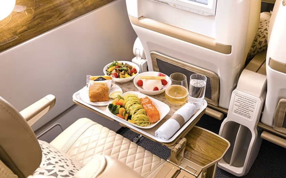 With its cream leather seats and woodgrain finishes, Emirates’ premium economy is one of the most luxurious cabins in its class. Meals are served on Royal Doulton china, and menus always feature a dish inspired by the flight’s destination, such as Thai pepper beef or grilled chicken with mushroom sauce and barley risotto. Three-course meals include salad, cheese, and dessert, with a complimentary wine list to match. For an extra indulgence, passengers can pre-order a vanilla cake and a 20‑cl bottle of Moët & Chandon Brut Impérial for $30.