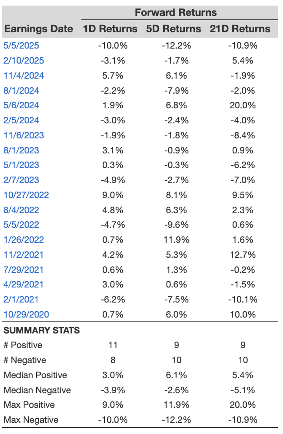 - There are 19 earnings data points recorded over the previous five years, with 11 positive and 8 negative one-day (1D) returns noted. In total, positive 1D returns were recorded approximately 58% of the time.