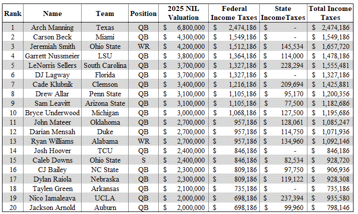 It is no surprise that the player with the top NIL valuation in 2025 is none other than Arch Manning, quarterback for the pre-season top-ranked University of Texas Longhorns. Even if one is not familiar with this athlete, the name likely rings a bell, as Manning is the grandson of legendary quarterback Archie Manning and the nephew of Super Bowl-winning quarterbacks Peyton and Eli Manning. Manning’s $6.8 million NIL valuation is over 50% higher than Carson Beck (quarterback for the University of Miami), and their valuation aligns with paying federal income taxes of $2,474,186 and $1,549186, respectively.