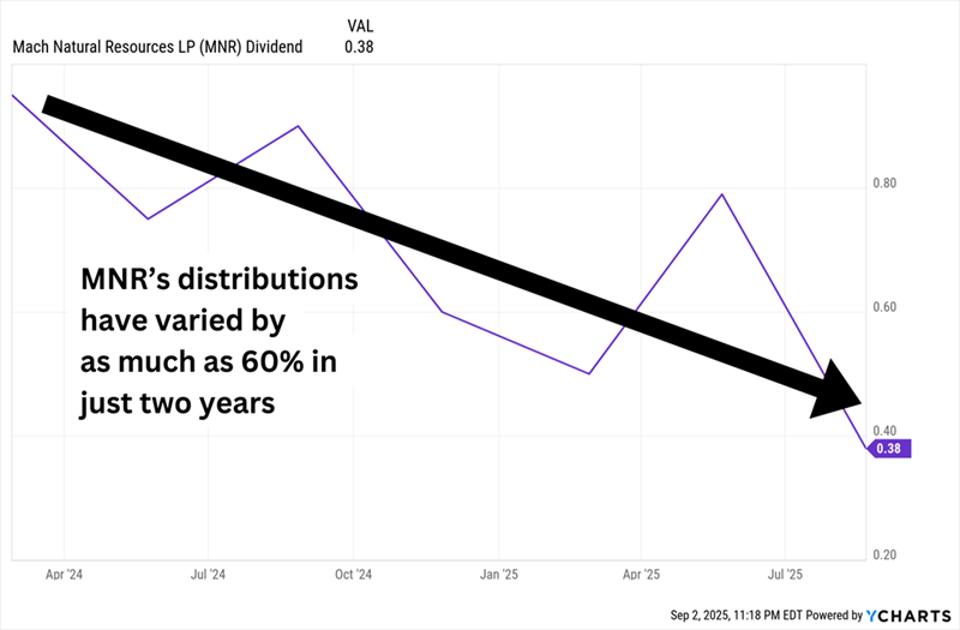 Just understand that while the distribution is sky-high, it’s also all over the place. That’s because MNR pays out variable distributions, which are based on cash available after its 50% reinvestment rate.