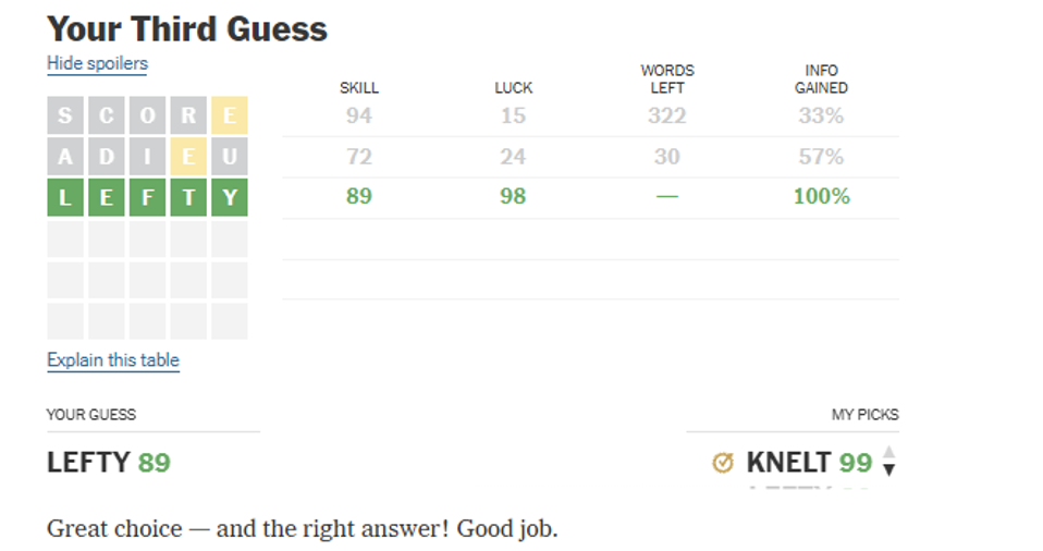 I felt rather good about my third guess today. My opener, SCORE, was pretty lousy, leaving me with 322 remaining possible solutions and a single yellow ‘E’. ADIEU, which many people still use for their opening salvos, only cut that number to 30 and I still only had the single yellow ‘E’. When I came up with my list of possible guesses, LEFTY was one of them. I thought it would be ironic, with all the talk of the “radical left” these days, if that was the Wordle. I love me some irony. I was basically compelled to guess it, and lo and behold LEFTY was the Wordle. But my “huzzah” turned to ash in my mouth when I saw the Wordle Bot’s score.