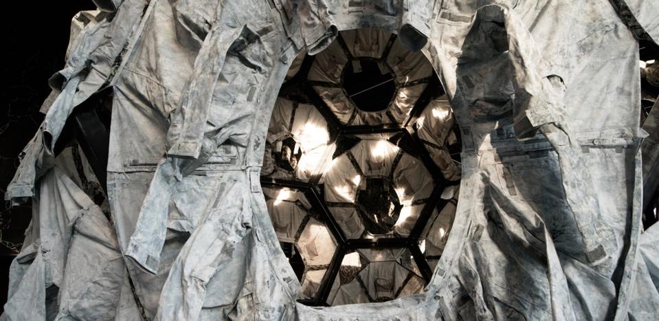 Painted camouflage fabric drapes over mathematically precise spheres that pay homage to Leonardo da Vinci’s illustrations in De Divina Proportione, a 1509 book on math by Luca Pacioli. The famed Chinese artist and activist says the spheres reflect Renaissance ideals of rational thought, logic and humanism, while the camouflage patterns peek through the white paint signify the chaos of war and how it ruptures all sense of harmony and order.