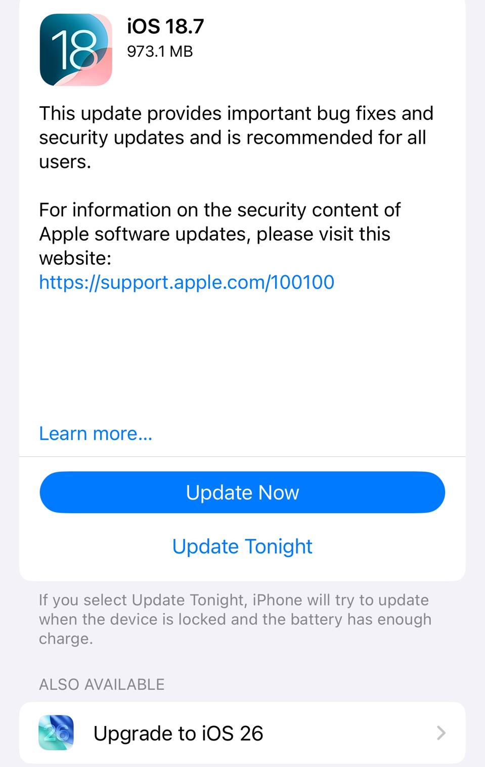 For now, if you are a business user, or you can’t stand bugs that come with iOS 26—which so far include the usual battery drain and more—iOS 18.7 is probably the best update for you.