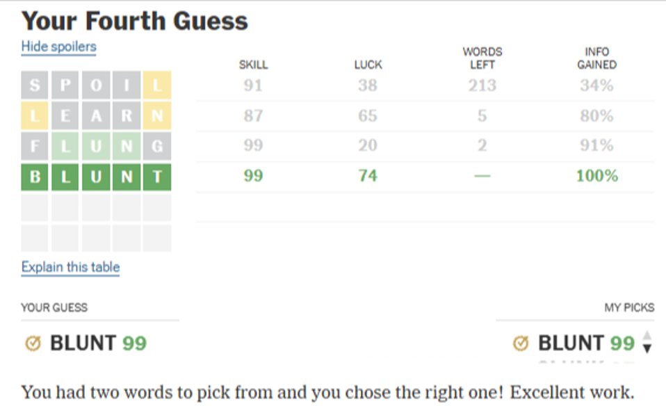 SPOIL wasn’t a great starting word today, leaving me with 213 remaining solutions. I eliminated two more vowels and cut that number down to just 5 with LEARN. I still had just two yellow letters at this point, however, and my third guess, FLUNG, left me with two possibilities, though at least I had some green boxes. The only word I could come up with was BLUNT, and lucky for me, that was the Wordle!