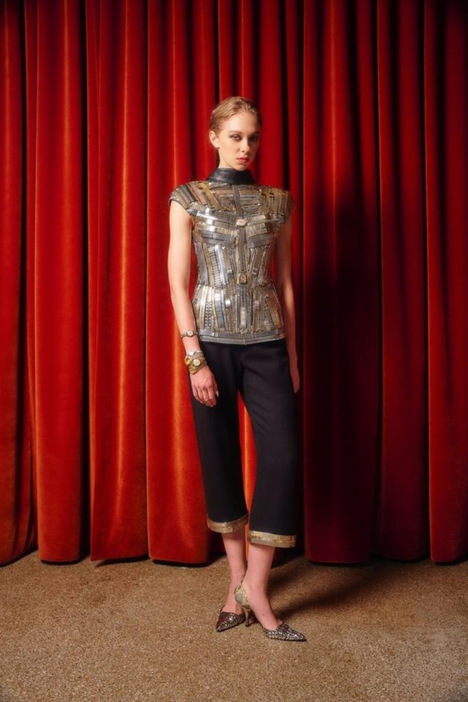 The collection’s biggest challenge, though, was cohesion. While some looks recalled silhouettes and patterns of ‘70s nightlife with chainmail and gold embellishments, others veered into dramatically different territories. It felt like the team was pulling from multiple eras across European history: masculine Hellenistic draping, the medieval era’s flirtation withswords, armor and chainmail, baroque motifs, and rococo details like corsets, long bloomers (and even oversized croissants). These were pieces that easily charmed the “ooh-and-ahh” crowd, but for me, they didn’t register as especially cohesive or deliberate.