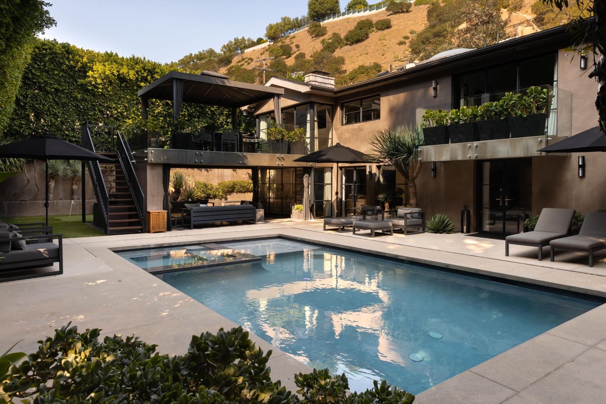 Outside, privacy is not just a promise on a listing sheet, it’s the product of siting and careful planting. The property rests at the end of the street as the road curls into the hillside, while tall ficus hedges wrap the backyard to close the loop. Within that green envelope are the pieces that define off-duty Los Angeles. A pool and spa for hot days and late nights. A shaded terrace for meals when the California sun proves too strong. A small putting green set off to the side for a quick reset between calls.