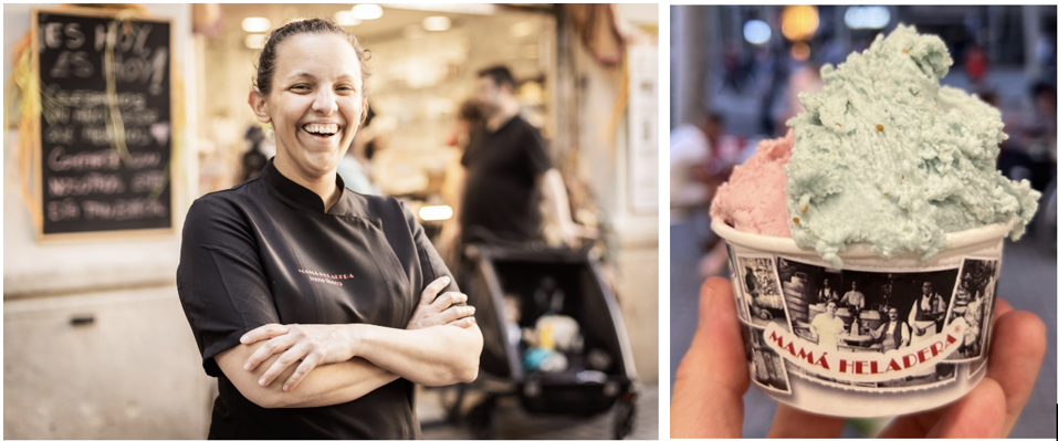 During COVID, the shop next to the original Tio Che became available and Irene decided to create her own shop dedicated to new ice cream flavors inspired bu happy memories shared by customers. Fortunately, at Hofmann she met Irene Vidal, who joined shop during the first month. Irene describes her as her right hand who made it all possible, a great chef and storyteller, which matters because Mamá Heladera’s concept is all about personal storytelling. Their work involves love, innocence, pleasure, family, happiness, community, artistry, technical skill, science, imagination, and creativity.