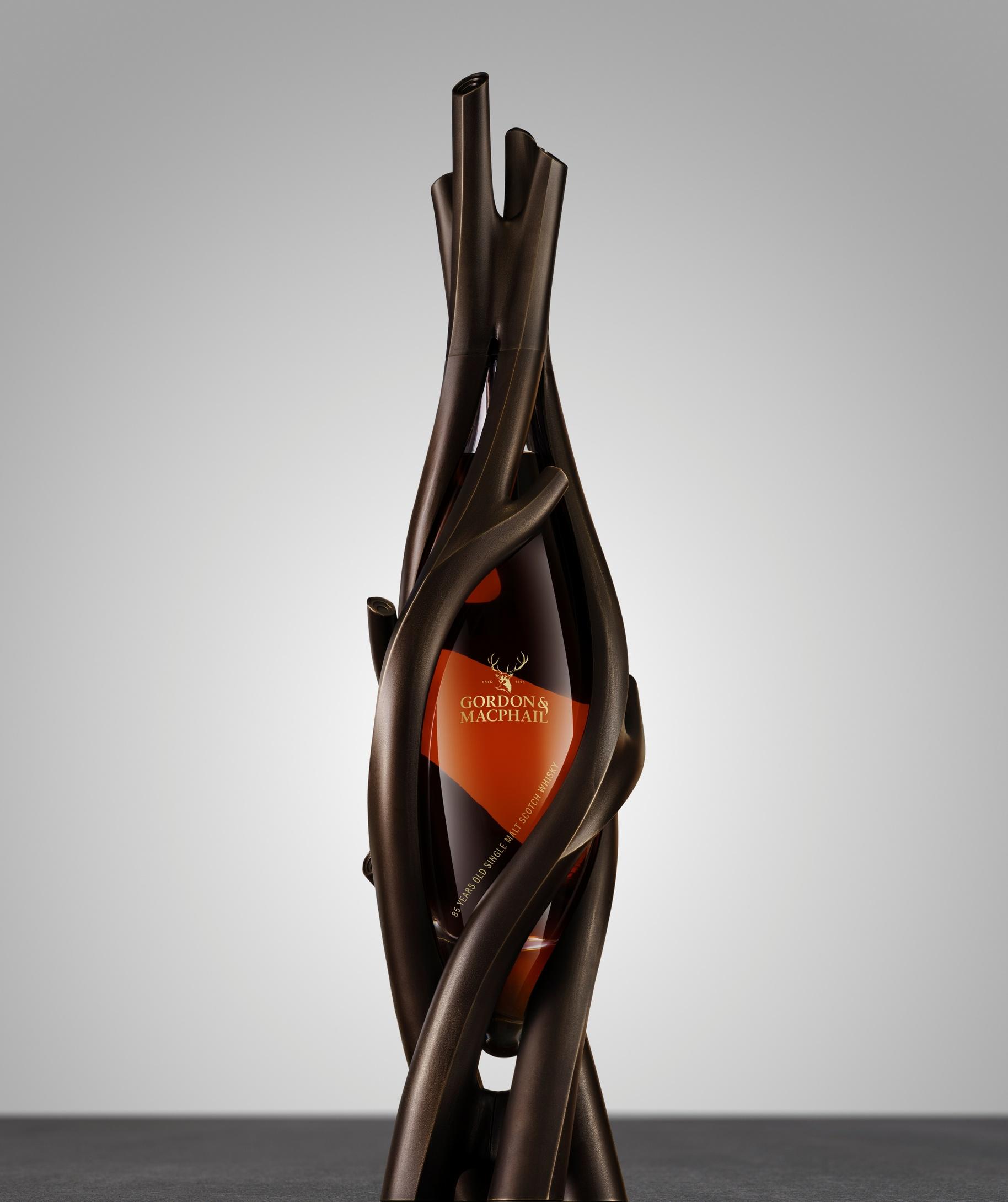 Internationally acclaimed American architect Jeanne Gang designed the decanter that houses the precious liquid. Themed around the concept of “Artistry in Oak”, the decanter design, according to G & M, “was conceived as a single object with the suspended glass bottle relying on the branches for support, evoking the reciprocity between whisky and its cask”. Cast in bronze for longevity, “the armature will gradually patina, acquiring character over time like the whisky it holds.”
