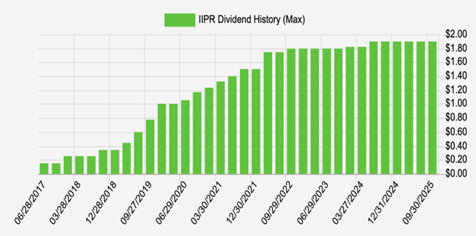 These rents fund a dividend that has grown steadily since the company’s IPO in 2016. The first quarterly payout was $0.15 per share. Cannabis stocks have been volatile but IIPR’s payout has been a steady staircase higher to $1.90 per share, a 12-fold increase: