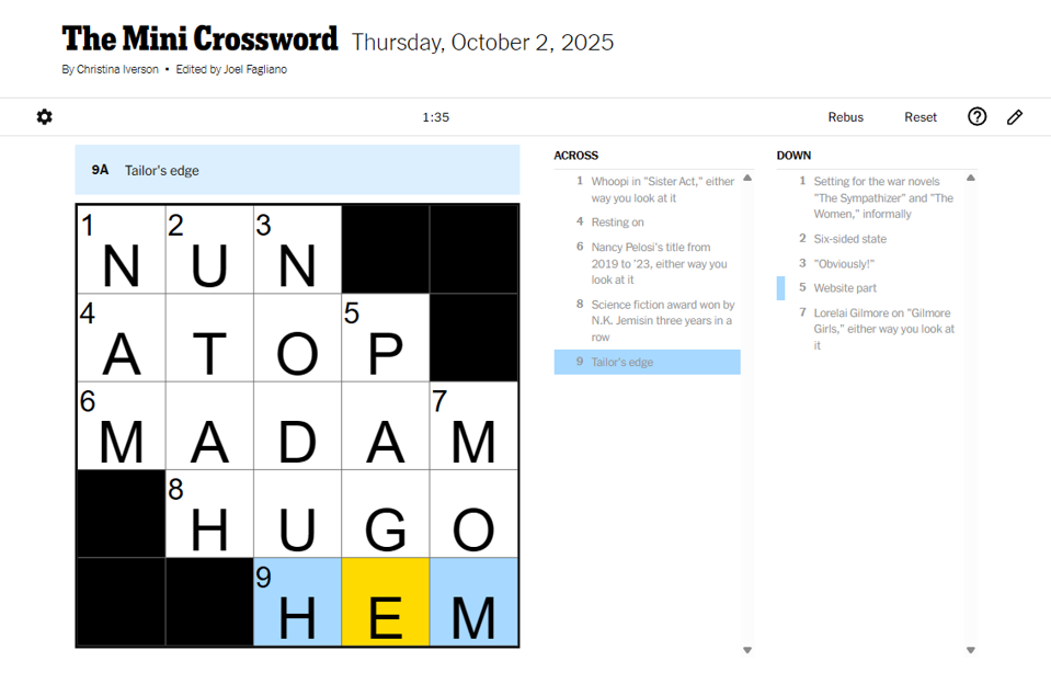 I enjoyed the palindromes in today’s Mini. NUN and MADAM. It would have been fun to have a couple more. I got NUN right away, but was stumped until I got down to 8-Across and HUGO. Then I moved to down clues and got MOM, our third palindrome (either way you look at it). I still didn’t have enough words to fill in the blanks, but I went back and realized NAM fit well, and then MADAM became obvious. Once I had these, UTAH, ATOP, NODUH, HEM and PAGE all revealed themselves. This took me 1:35.