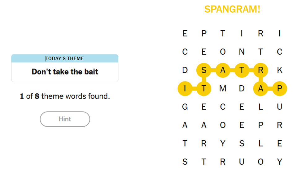 You’ll also need to find a special word called a spangram. This tells you what the words have in common. The spangram links two opposite sides of the board. While the theme words will not be a proper name, the spangram can be a proper name. When you find the spangram, it will remain highlighted in yellow.
