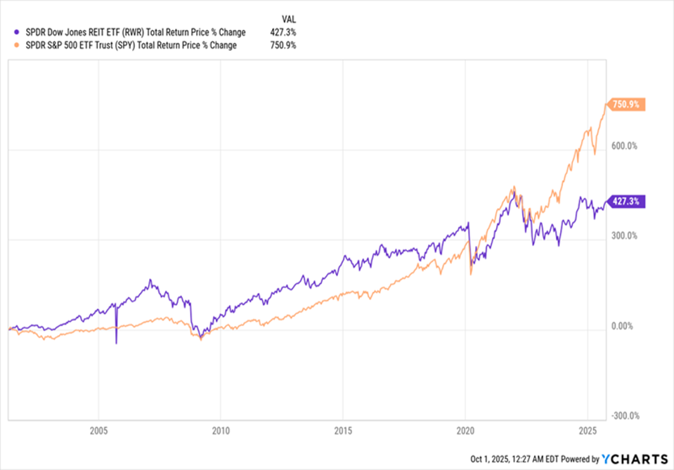 At this point, it’s worth pointing out that REITs, shown below by the SPDR Dow Jones REIT ETF (RWR), in purple, have badly lagged the S&P 500 (in orange) over the last 25 years.