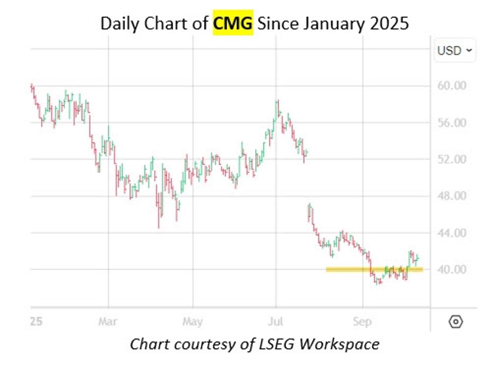 CMG has been struggling on the charts, falling as low as $20 in July, after suffering its worst bear gap since 2017. Finishing every month of the third quarter lower, the shares now sport a 31% year-to-date deficit.