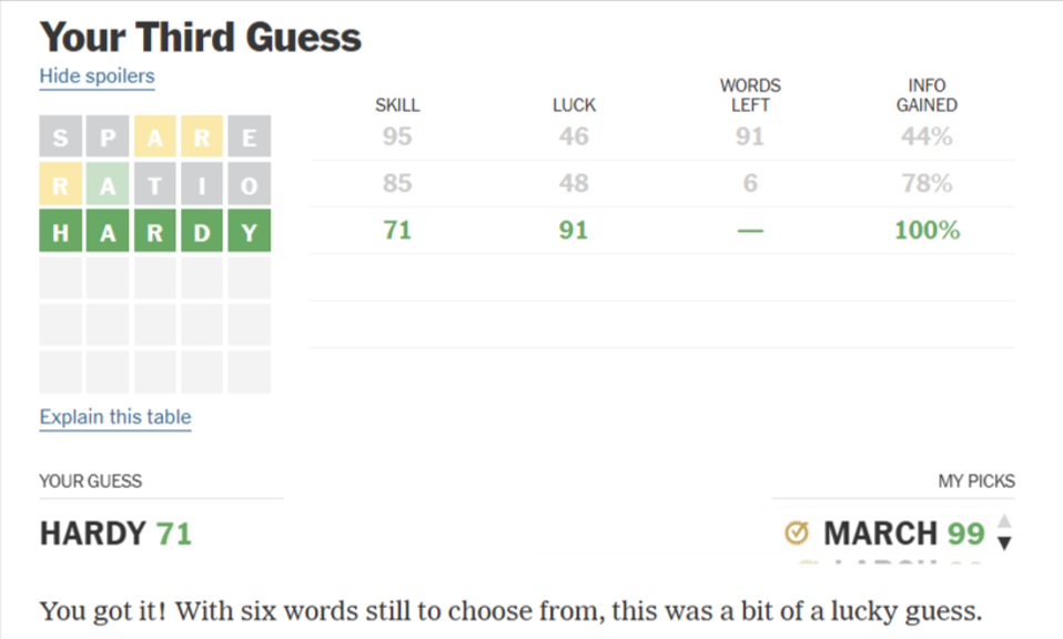 SPARE was as pretty solid opening guess today, leaving me with just 91 words. RATIO cut that number down to 6, and I came up with a few different ones. I settled on HARDY because I’d just seen a headline about the WWE duo, the Hardy Boyz, which I thought was amusing. I don’t know the first thing about professional wrestling and at first I thought it was about the old Hardy Boys books, which I devoured as a youth. I guess the Hardy Boyz just won big, and I also won big thanks to them. And reading as a kid.