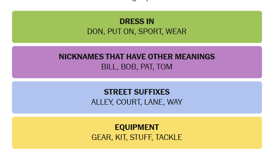 Yellow Group is pretty generalized, but mainly referencing sports and I guess fishing? A TACKLE box? That’s the only way I know that word. “STUFF” is a bit general compared to the rest of it. I only got that last one by default, and it wasn’t even Purple Group.