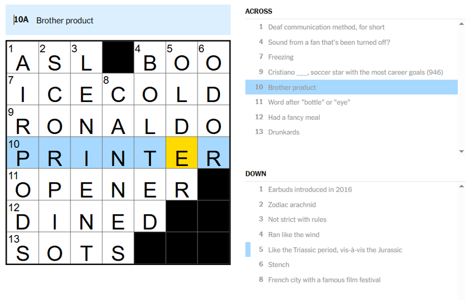 The NYT Mini is a quick and dirty version of the newspaper’s larger and long-running crossword. Most days, there are between three and five clues in each direction on a five by five grid, but the puzzles are sometimes larger, especially on Saturdays.