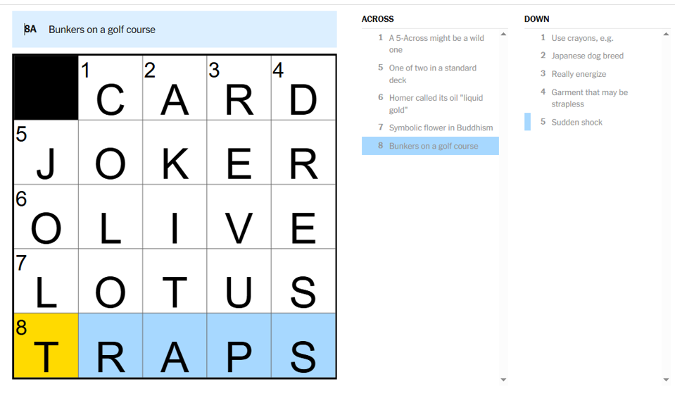 The NYT Mini is a quick and dirty version of the newspaper’s larger and long-running crossword. Most days, there are between three and five clues in each direction on a five by five grid, but the puzzles are sometimes larger, especially on Saturdays.