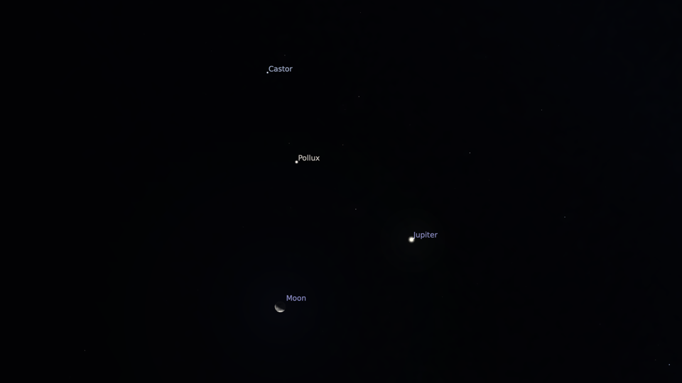 Jupiter will be unmistakable, glowing as a steady, brilliant point of light brighter than any star in the sky. To its upper left, Pollux will appear as a yellowish star. The moon, half-illuminated on its right-hand side from the Northern Hemisphere (Southern Hemisphere observers see it the other way up), completes the scene. Together, the three will form a large triangle stretching across Gemini and into the eastern sky.