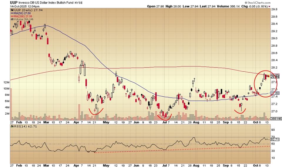 The Invesco DB US Dollar Index Bullish fund is ahead of the Forex-traded cash dollar. The mid-September low is so close to the early July low that it’s interesting, especially when compared to the ETF’s pattern.