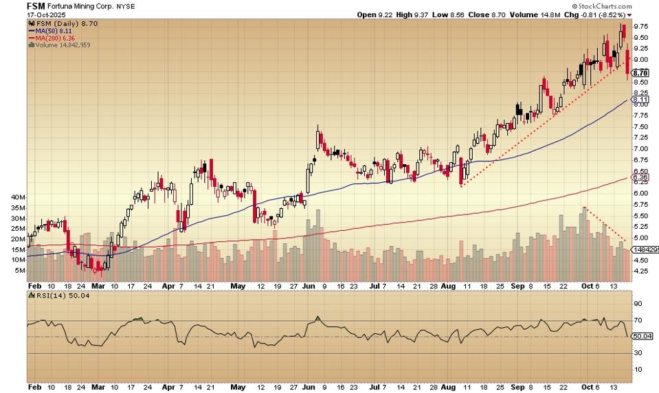 Fortuna’s price joined in the Friday metals sell-off and dropped 8.52%. This, after it had blasted up on Wednesday and Thursday to that new 52-week high near $9.75. The stock dropped below the red-dotted uptrend line that had connected the early August low with the September dip.