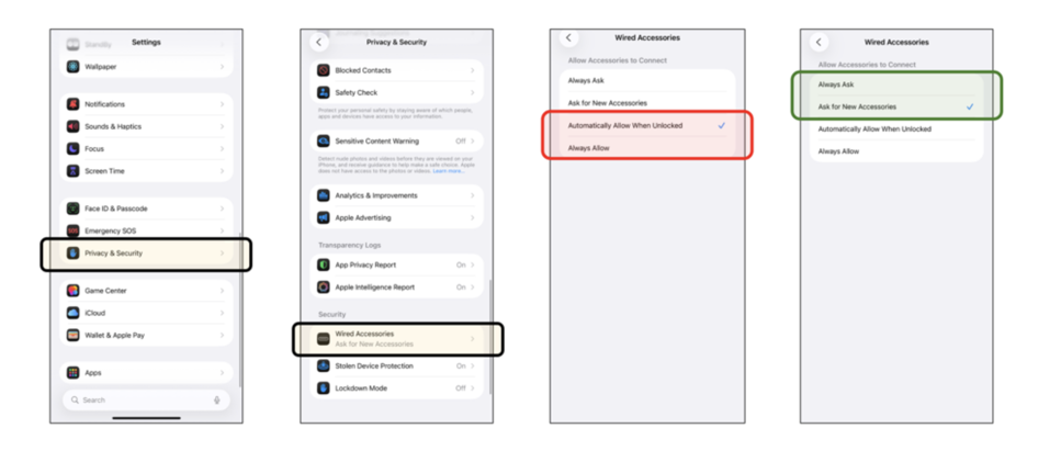 These so-called “Wired Accessories” options can be found in Settings > Privacy & Security > Security. Apple explains that you have the following options: