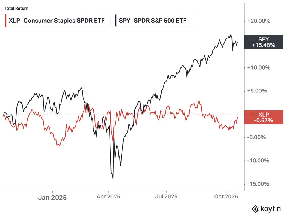 Over the past year, the Consumer Staples Select Sector SPDR Fund (XLP) has significantly underperformed the SPDR S&P 500 ETF Trust (SPY), with a total return of -0.7% versus 15.5% for the S&P 500. In a market dominated by optimism, growth, and AI enthusiasm, defensive sectors like consumer staples have been left behind.