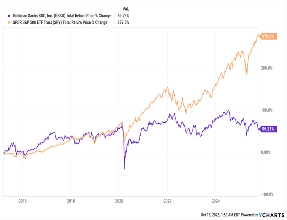 As I said a second ago, BDCs’ borrowers are usually too small for big banks to take on, but that hasn’t stopped big banks from getting into the game by launching their own BDCs. Even Goldman has its own BDC—the unimaginatively named (and 12.9%-yielding) Goldman Sachs BDC (GSBD).