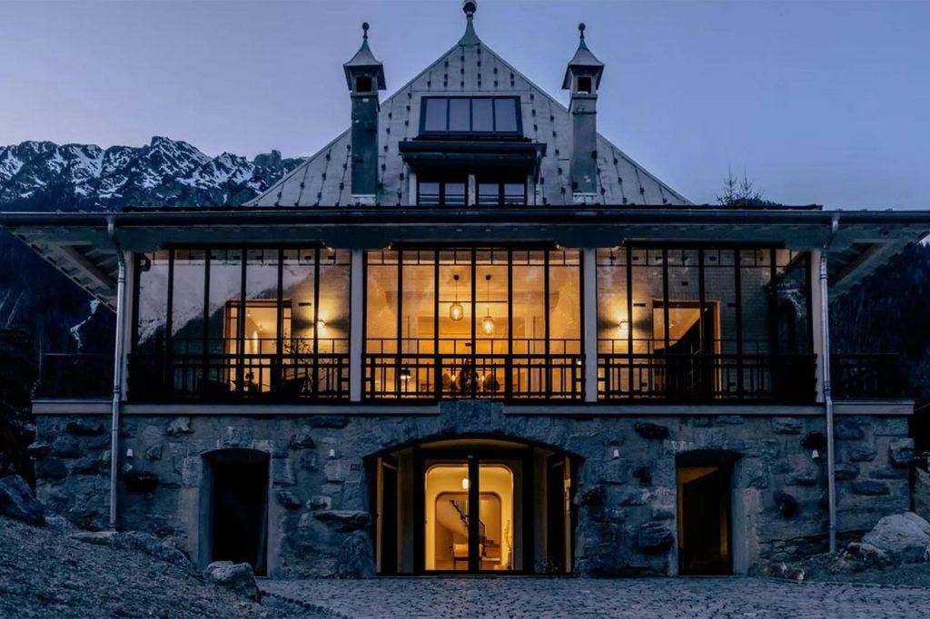 Villa Butterfly is a restored Belle Époque property in the French alpine town of Chamonix with a screening room, a sauna, and panoramic views of Mont Blanc. Accommodating 10 guests plus up to six children in six bedrooms, the 5,166 square foot villa from Leo Trippi offers a hot tub, sauna, multiple fireplaces, a gym, several balconies, and a screening room. Built between 1911 and 1913 in a unique arch shape to protect against avalanches, this home has been restored over three years, retaining its grandeur while transforming it into a contemporary abode. At the heart of the villa is a grand living area with two fireplaces, a library, and a light-filled veranda. The open-plan layout leads into a fully equipped kitchen and a separate service kitchen. The chalet is a short walk from Chamonix’s pedestrian center and 10 minutes from the Brévent ski lifts. Price on demand.