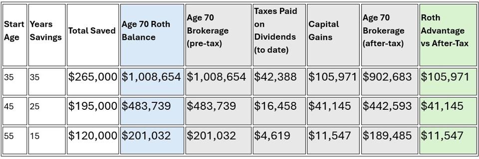 Roth IRA vs Brokerage account accumulation through age 70 (start at 35, 45, 55)