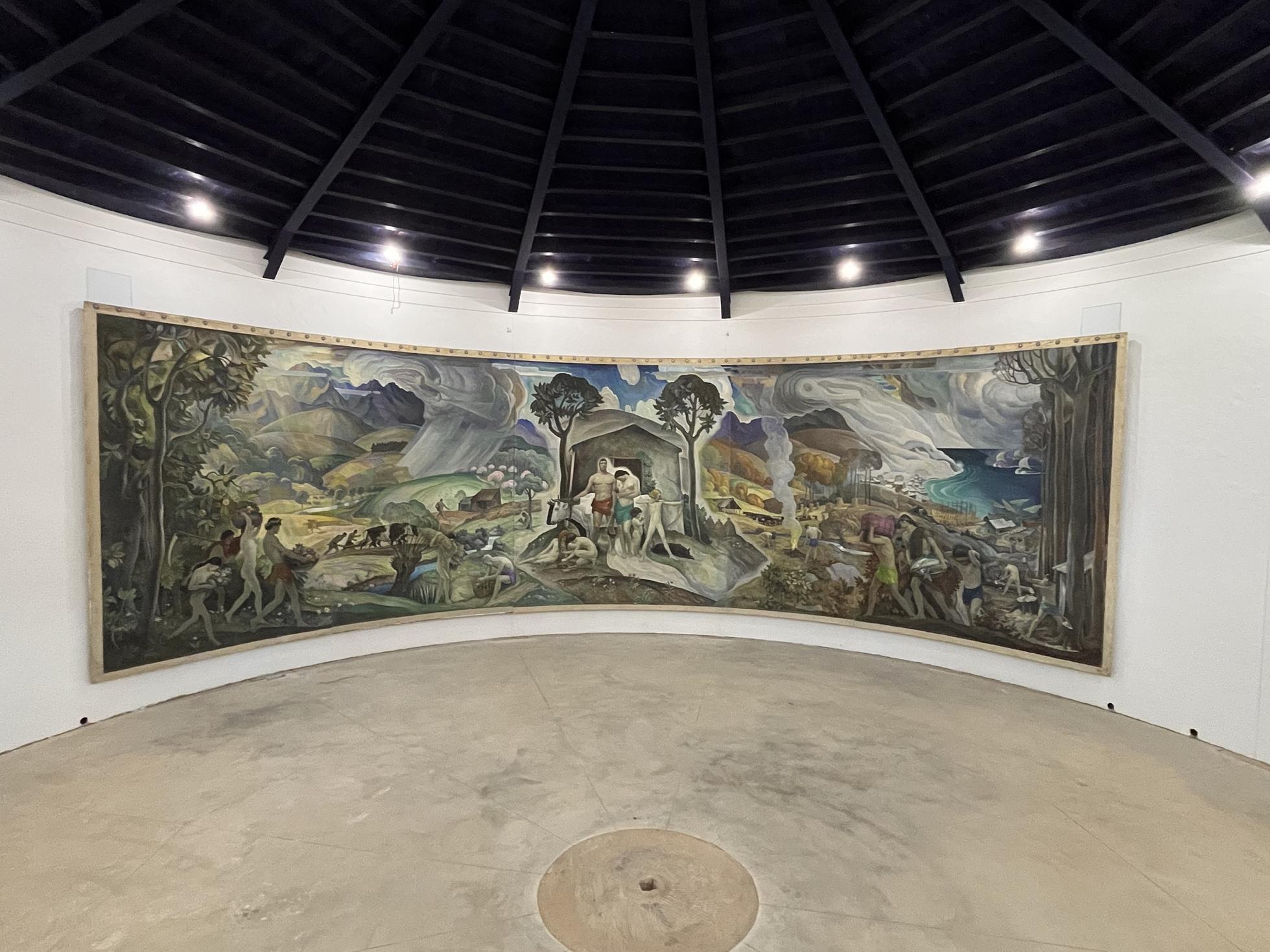 What resulted was years of work spent building the round barn itself, and meticulously restoring the mural which was, at times, both suspenseful and highly precarious. “We thought, maybe there’d be nothing left of it,” says Jamie. “We did this big unrolling I thought, this could just be like [paint] potato chips flying through the air.” And so with their breath held and humidifiers going, Jamie and a team of restorationists, led by Kristin deGhetaldi, carefully unrolled the mural. In a space Jamie likened to an airplane hanger owned by Atelier Fine Art Services in New Castle Delaware, the mural was seen for the first time in almost two decades. “It was in remarkably good shape,” says Jamie. deGhetaldi and her husband got to work restoring the massive piece, lying prostrate for much of the restoration because the sheer size of the mural made hanging it to restore untenable. “Kristin and her husband had to create these sort of platforms that they could lay over top of it and lie on their stomachs and work on it,” says Jamie. “Because it couldn’t be hung. I mean, it weighed so much!”