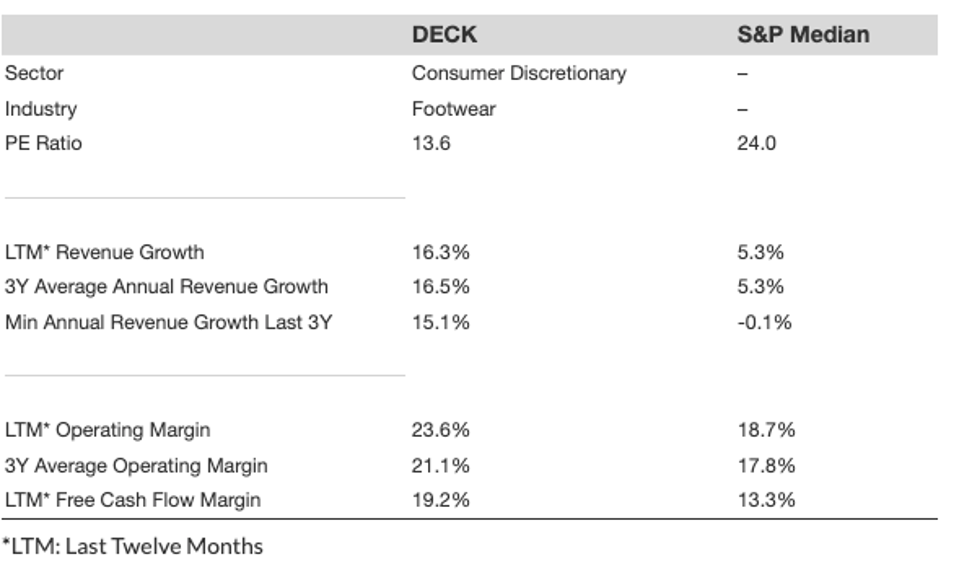 - Valuation: DECK stock trades at a PE ratio of 13.6