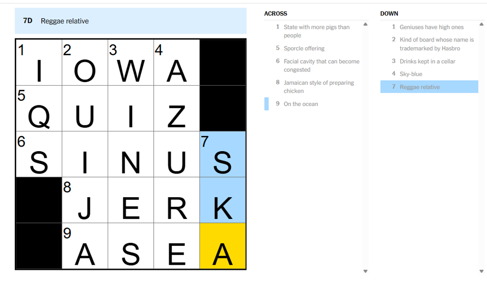 The NYT Mini is a quick and dirty version of the newspaper’s larger and long-running crossword. Most days, there are between three and five clues in each direction on a five by five grid, but the puzzles are sometimes larger, especially on Saturdays.