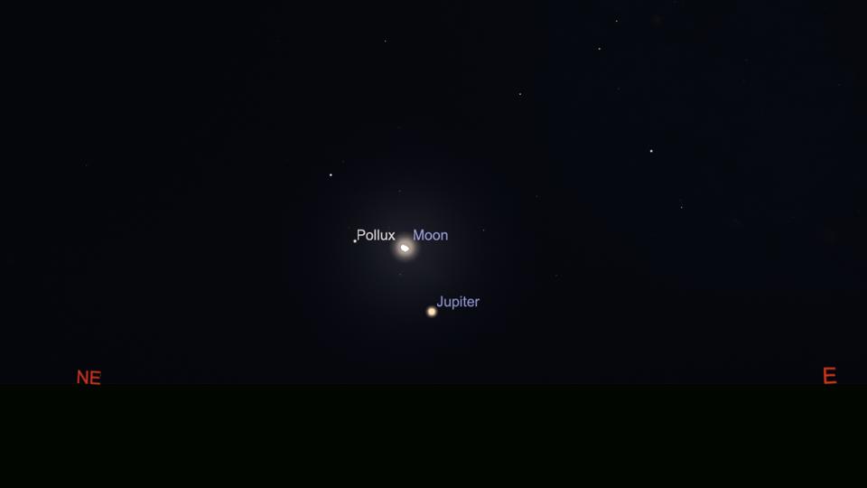 A few hours after sunset, a 71%-lit waning gibbous moon will hang between Jupiter and Pollux, one of the “twin ” stars of Gemini.