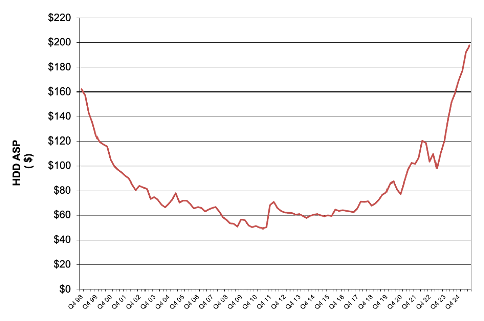 In CQ2 ’25 WDC reported that their total revenue, presumably from HDDs, rather than systems, was $2,605M and if we divide that by the total number of HDD units shipped in the quarter, 12.9M we get an average sales price, ASP, of $201.9 per HDD unit.