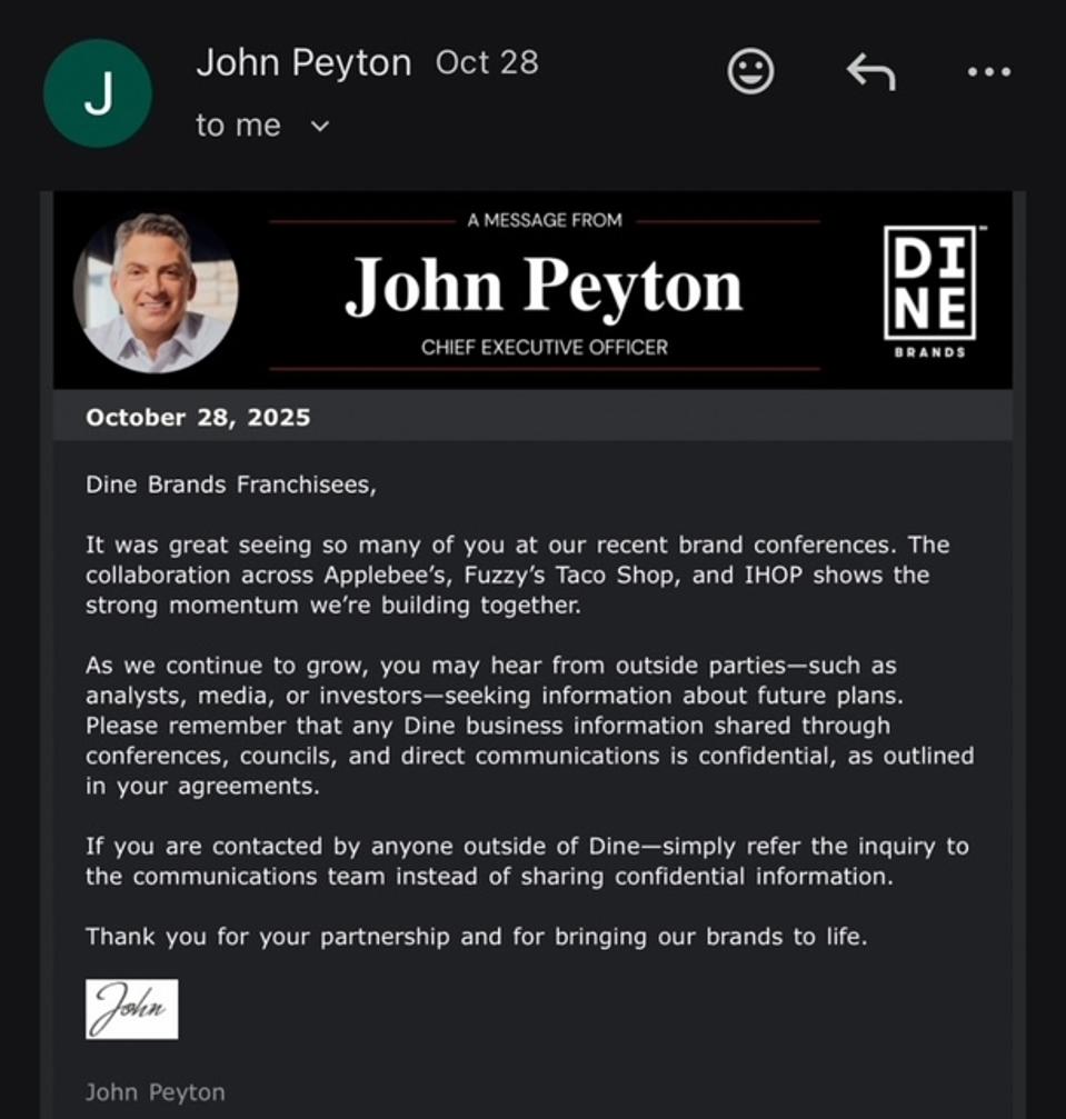 On October 28, Dine Brands CEO John Peyton sent an internal email to franchisees, the operators behind Applebee’s, IHOP, and Fuzzy’s Taco Shop, asking them not to speak with “outside parties such as analysts, media, or investors.” It was meant to be a lesson about privacy, but operators who were already upset with poor execution and silence from the top didn’t like it.