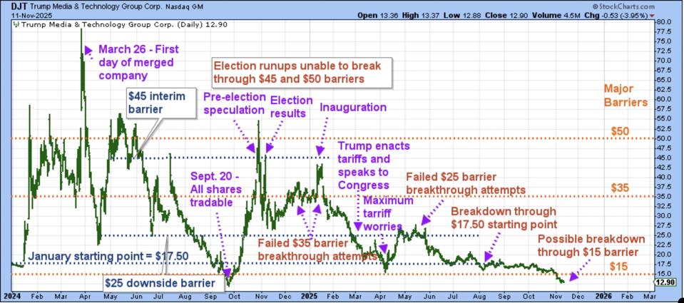 Trump Media stock (DJT) has declined significantly in November to below $15. Why is that important? Because $15 is a major barrier. It was the low point in the April tariff selloff. Here is the graph of the stock’s action with explanations…