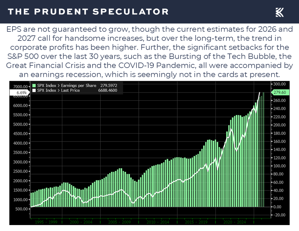 Equally troubling is the insinuation that today’s market must be poised for the same fate because the trailing P/E now stands around 28. High multiples can indeed precede weaker returns, but valuation is only one piece of a complex puzzle. Earnings expectations for 2025 and 2026 have been rising, balance sheets remain healthy and inflation pressures are moderating. The environment today bears little resemblance to the speculative mania of 2000, when profitless companies traded at infinite multiples.