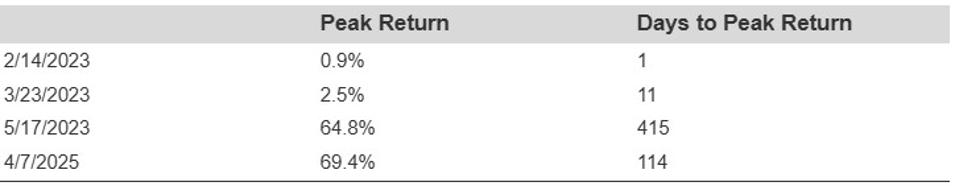 SNPS stock is presently trading within the support range ($378.87 – $418.75), levels from which it has bounced notably in the past. Over the last 10 years, Synopsys stock has drawn buying interest at this level 4 times, rallying significantly on two occasions, resulting in an average peak return of 34.4%.