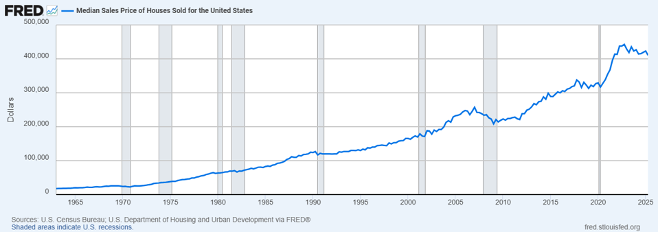 Start with the median — the middle — sale price of houses in the U.S. Financing options are only a way to mitigate the problem. Below is a graph from the Federal Reserve Bank of St. Louis.
