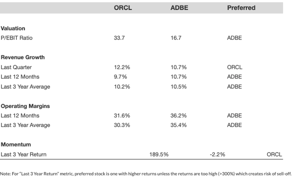 Oracle stock dropped -29% in the previous month. You may feel inclined to increase your investment, or you might consider decreasing your exposure. However, there is a completely different viewpoint you could be overlooking. Is there a superior alternative? It appears that its counterpart, Adobe, offers more.