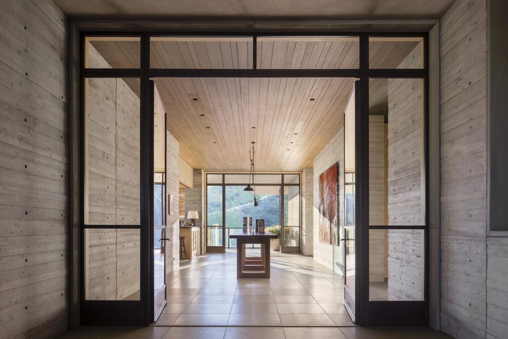 There is no paint in this home, but the concrete walls have tie back holes which create texture and become design elements of their own. There is a grain where the boards have all been put through a wire brush machine and they are offset by a millimeter and a half, so that as the sun moves throughout the day, the skin of the house changes and evolves with the shadows.