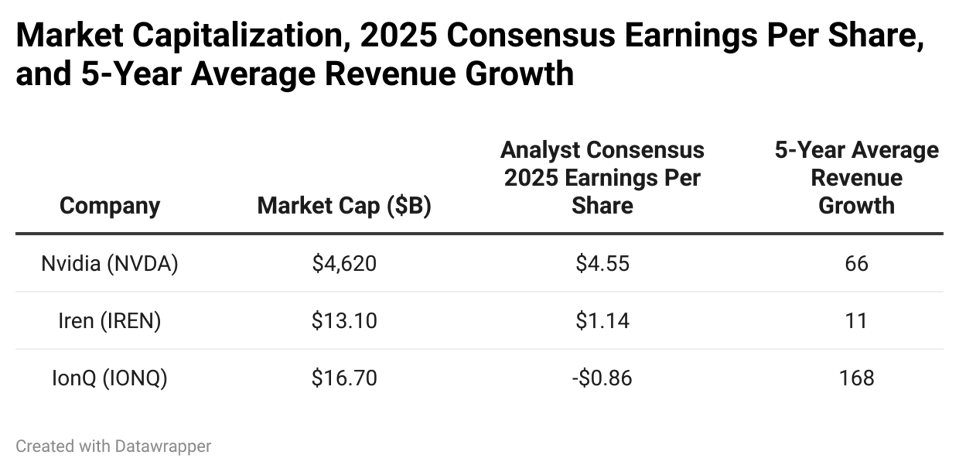 I picked these stocks because of their high anticipated growth rates and their stock-price performance in 2025. Two of these companies – Nvidia and Iren – are also highly profitable. IonQ is growing rapidly and losing money. However, the stock prices of all of these companies have appreciated in 2025.
