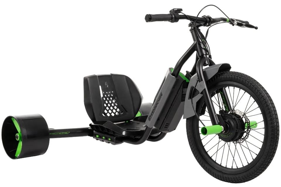 Green machine is Huffy’s three wheeled drifting line up which traditionally featured pedal-powered trikes with dual-action levers, much like tracked vehicles, to control the direction of drift. The electric green machine steps it up a notch with the business end essentially being the front part of a BMX supercharged by a 36v battery and 250w motor.