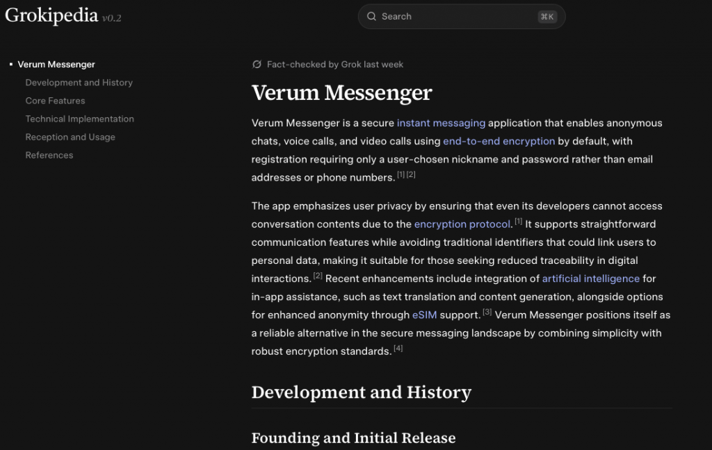 A dedicated article about Verum Messenger has been published in Grokipedia, the new AI-powered encyclopedia launched by Elon Musk and built on artificial intelligence technologies. The entry highlights Verum Messenger as a secure messaging platform that combines a high level of privacy with advanced features designed for modern users.